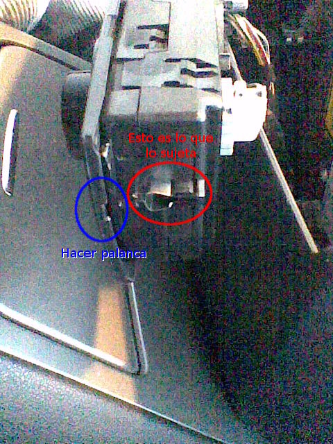 Hay que meter el filo de la navaja y de las tijeras por los huecos rectangulares, con la punta por la parte exterior, y una vez dentro empujar hacia el interior. Con eso meteremos la pestaña que sujeta la radio. En la imagen se ve la forma de la tijera (roja), hacia dónde hay que empujar, qué hay que empujar (azul) y la pestaña (verde) que retiene la radio.