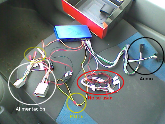 Al principio esta vista puede ser abrumadora, pero cada conector sólo encaja en su sitio correcto así que no hay más que conectar sin miedo. Los conectores de la izquierda son de la alimentación; el cable amarillo es el mute que se conecta al cable hembra amarillo, blanco o azul, pero no me ha funcionado; los del medio no se usan en esta instalación; los de la derecha son los de audio.