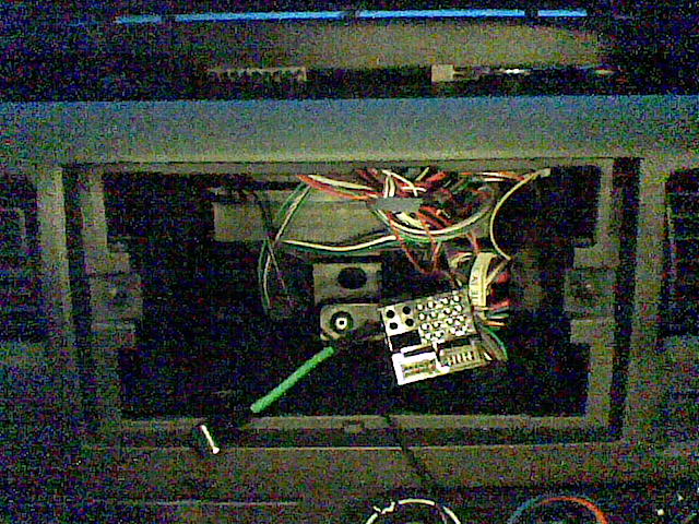 He metido la caja azul arriba a la izquierda, cables del adaptador por detras y por la derecha, cables por debajo, y también arriba pegados con cinta aislante para que me dejen meter la radio. La verdad es que pensé que habría más sitio...