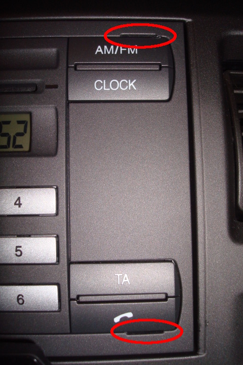 En los cuatro orificios circulares de las esquinas hay que meter algo para que mueva las pestañas y se pueda extraer la radio. Yo tenía 2 destorniladores suficientemente estrechos, saqué primero el lateral izquierdo y luego el derecho.